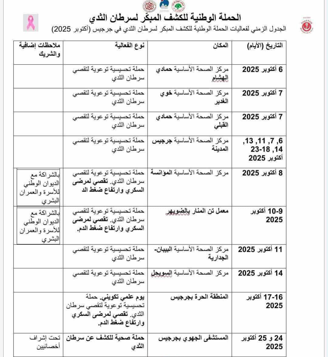 شرع المستشفى الجهوي والدائرة الصحية بجرجيس بالشراكة مع الديوان الوطني للأسرة والعمران البشري في تنفيذ الحملة الوطنية للكشف المبكر عن سرطان الثدي وتمت برمجة حوالي 20 حملة تحسيسية لتقصي سرطان الثدي والسكري وضغط الدم في مختلف مراكز الصحة الأساسية بالجهة وكذلك ببعض المؤسسات الاقتصادية بجرجيس .