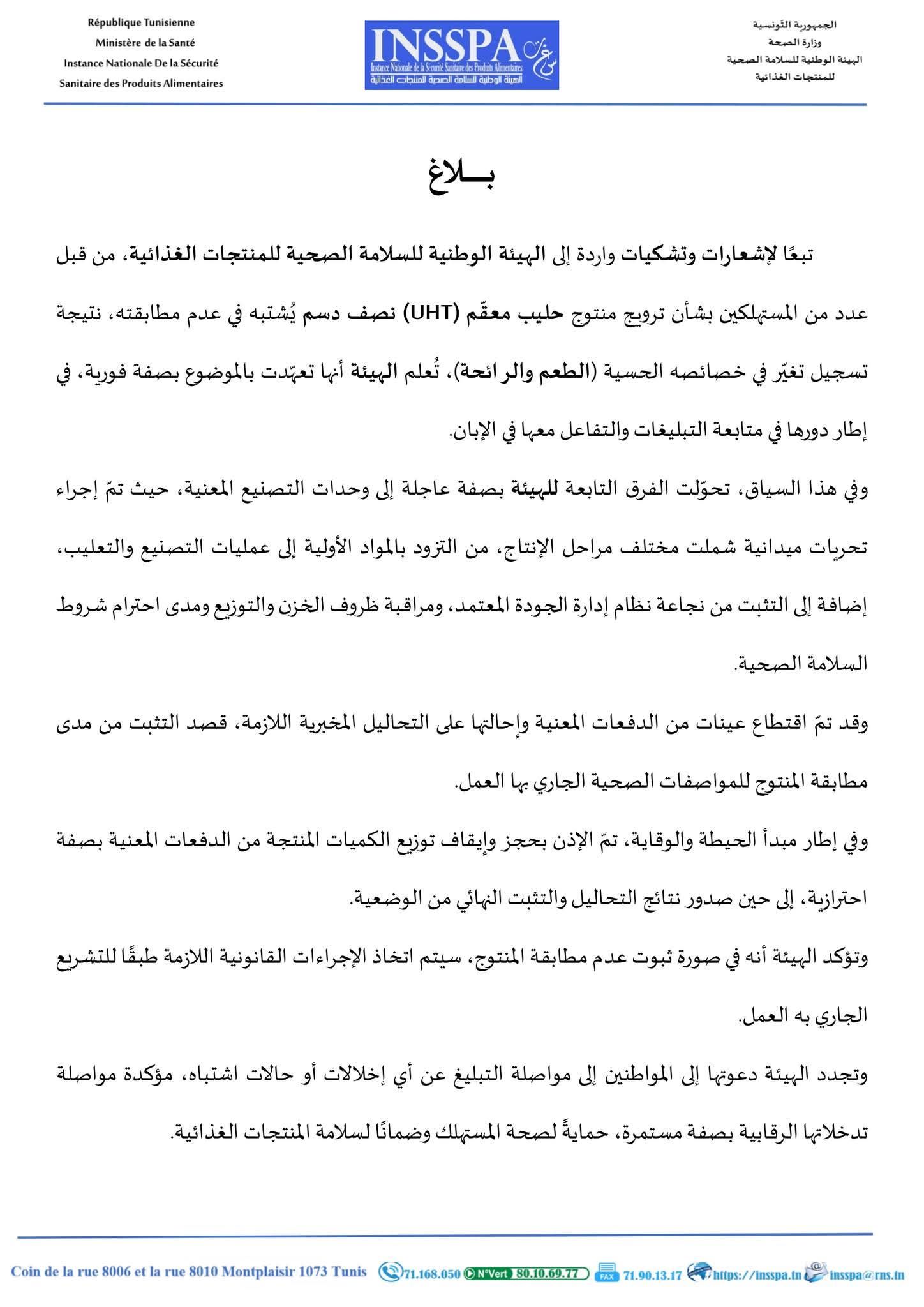 أذنت الهيئة الوطنية للسلامة الصحية للمنتجات الغذائية بحجز وإيقاف توزيع كميات من الحليب المعقّم نصف الدسم بصفة احترازية على خلفية إشعارات وتشكيات وردت بشأن منتوج يُشتبه في عدم مطابقته لمعايير السلامة الصحية من حيث الطعم والرائحة.